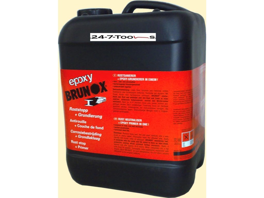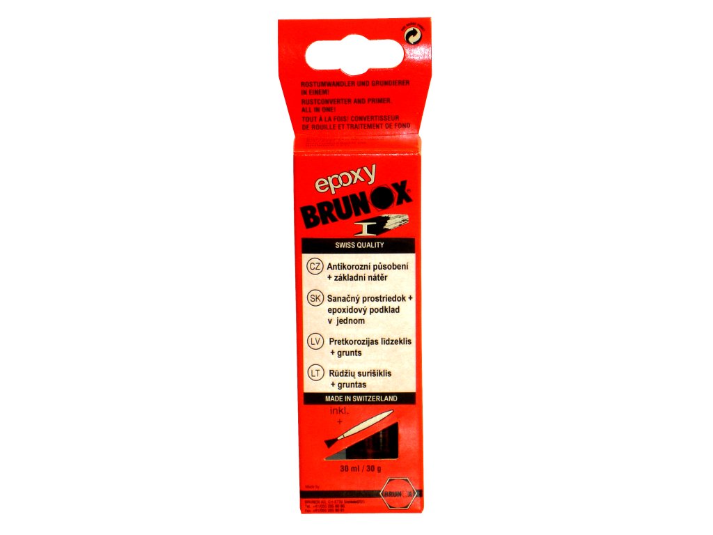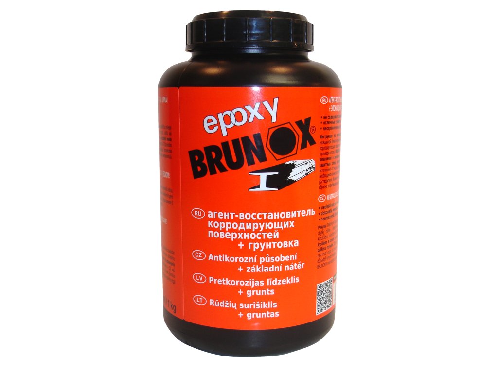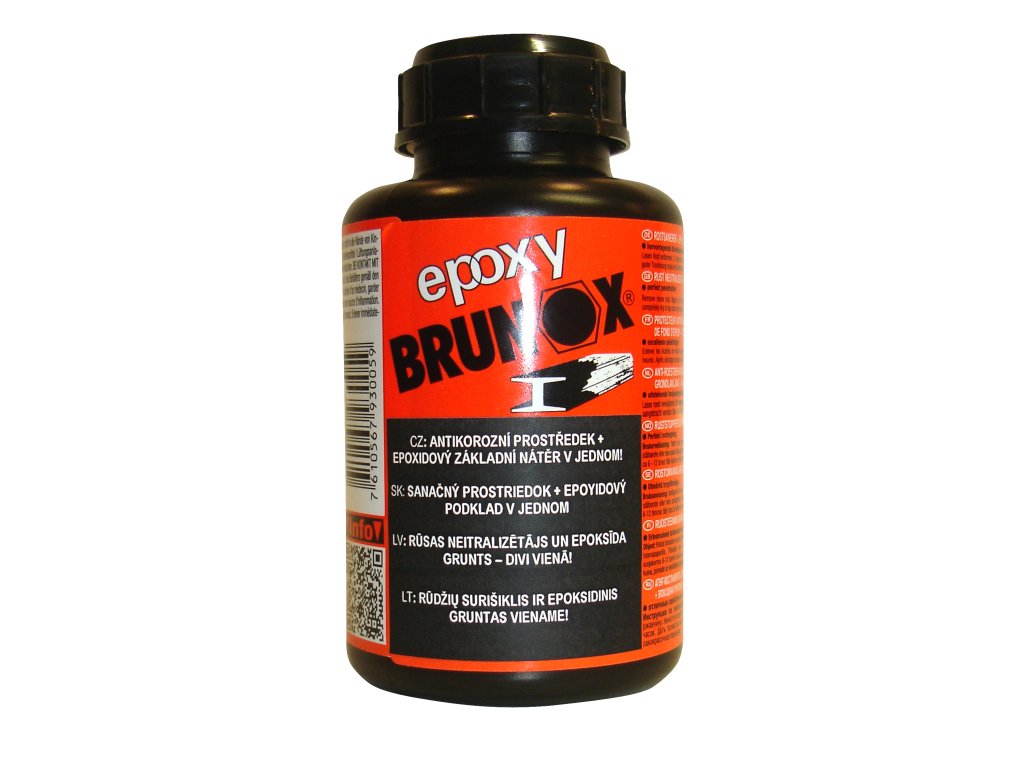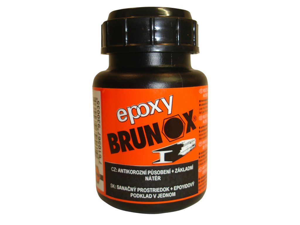 Brunox Epoxy je inovativní produkt na základě epoxidových pryskyřic určený k ochraně a opravě zrezivělých povrchů. Vzhledem k jeho schopnosti pronikat do pórů rzi a vytvářet pevnou ochrannou vrstvu, je ideální pro použití v průmyslové výrobě konstrukcí, strojů, vozidel atd., kde je potřeba zajistit dlouhodobou ochranu kovových komponent. Jeho aplikace je snadná díky tekuté formě. Koňakově zabarvená čirá tekutina tvoří s neutralizovanou vrstvou rzi kovově organický železitý komplex. Tato tvořící se černá velmi kompaktní a odolná ochranná vrstva poskytuje dlouhodobou ochranu před korozí a je díky obsahu epoxidových pryskyřic současně perfektní podkladovou vrstvou. Neobsahuje těžké kovy a anorganické kyseliny. Je neomezeně skladovatelný a ředitelný acetonem. Snáší se s krycími laky a tmely z obchodní sítě. Před aplikací Brunox Epoxy je důležité důkladně vyčistit zrezivělý povrch, aby se zajistila maximální účinnost sanace.