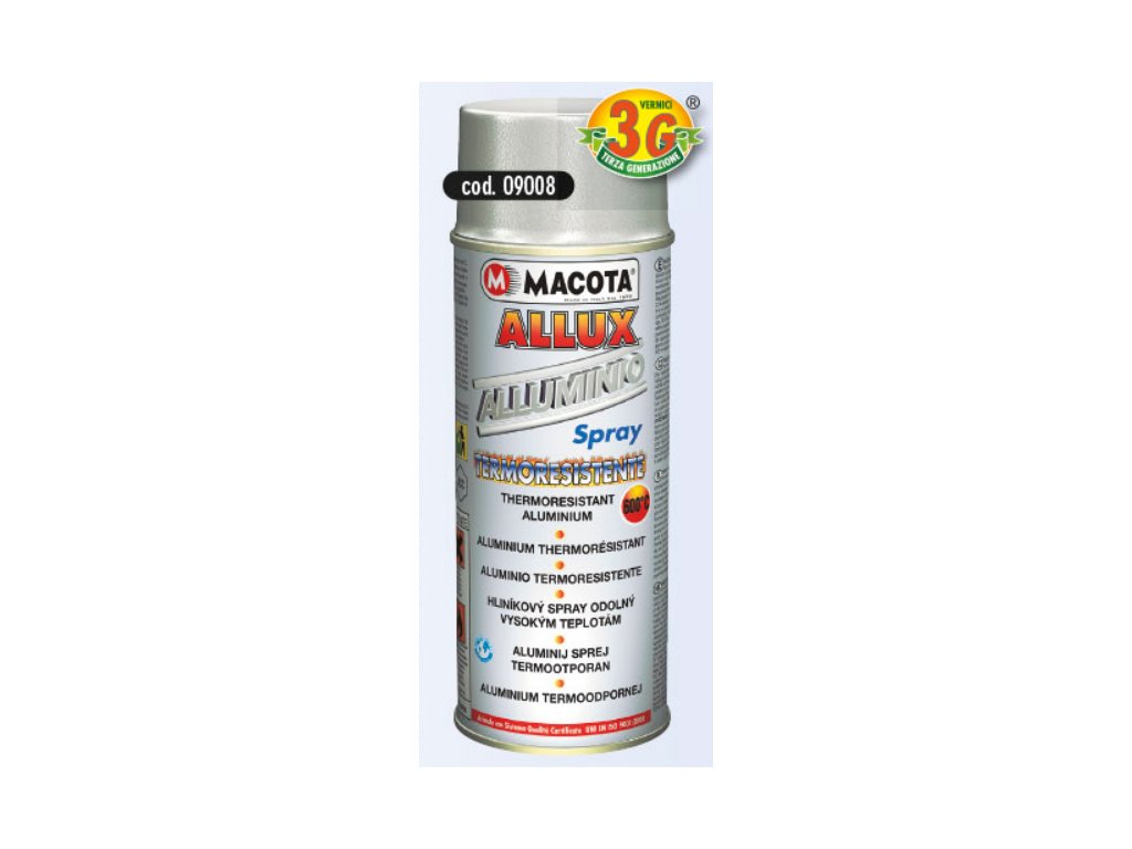 Hliník ve spreji vytvářející při nástřiku rovnoměrný a homogenní povrch, s vrstevnatou strukturou - odolný až do 600°C. Díky vlastnostech vrstevnatých pigmentů zachovává Allux svůj barevný odstín také po dlouhodobém termickém působení. Allux je ideální k použití při obrábění, údržbě zařízení a výrobků z hliníku vystavených vysokým teplotám. Důkladně očištěte povrch od rzi před jeho nástřikem a protřepejte sprej po dobu několika minut.Doplňkové parametry