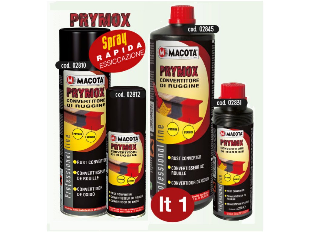 Zamezuje korozi a vytváří tvrdou ochrannou vrstvu vhodnou k přelakování. Prymox může být aplikovaný na každý povrch přesto, že není rezavý. Tam, kde rez již započala, ji zastaví a transformuje v silnou ochrannou vrstvu tmavé barvy perfektně zapuštěnou do povrchu kovu, připravenou k dalšímu přelakování. Tam, kde rez ještě nezapočala, zajistí velmi dobrou antikorozní a antioxidační ochranu. Může být kdykoli Přelakována. Suchý na dotek po 15 minutách. Přelakovatelný po 2-3 hodinách, v závislosti na okolní teplotě.Doplňkové parametry